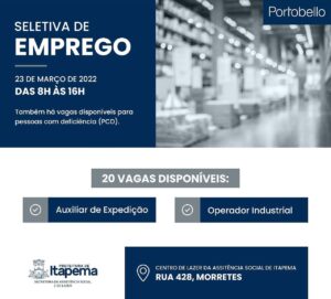 O Sine de Itapema irá realizar na próxima quarta-feira (23/03) uma seletiva para vaga de emprego, em parceria com as empresas Portobello e RH Brasil Recursos Humanos. São 20 vagas disponíveis para os cargos de auxiliar de expedição e operador industrial.