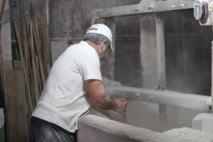 O enfarinhamento inicia em junho e segue até setembro, produzindo anualmente 13 mil quilos de farinha. O processo artesanal da farinha começa no raspador, onde duas pessoas tiram as cascas da mandioca. “Após, a raiz é levada para uma prensa com água onde permanece por duas horas aproximadas, peneirada e por fim é levada para os fornos onde acontece o processo final da fabricação e segue para a venda” explica Pedro.