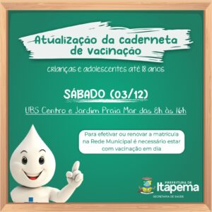 30/11/22 – As Unidades Básicas de Saúde (UBS) Centro e Jardim Praiamar estarão abertas neste sábado (03/12) para atualização da caderneta de vacinação das crianças e adolescentes até 18 anos. O horário de atendimento será das 8h às 16h e seguirá a ordem de entrega de senhas.