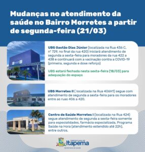A Prefeitura de Itapema, por meio da Secretaria de Saúde, informa que a UBS Gastão Dias Júnior (localizada na Rua 436 C, nº 729, no final da rua 420, Bairro Morretes), iniciará o atendimento aos pacientes. A UBS, que continua sendo referência para a vacinação contra a COVID-19, estará fechada na sexta-feira (18/03) e abrirá a partir da segunda-feira (21/03) também com uma equipe de estratégia da família.