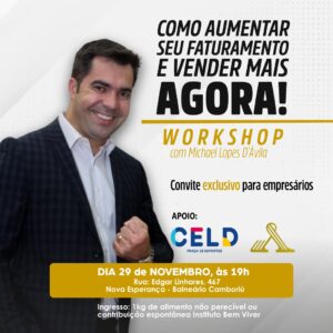 O Workshop “Como aumentar seu faturamento e vender mais agora!”, é voltado a empresários. A entrada é 1 quilo de alimento ou uma contribuição espontânea que será revertida para o Instituto Bem Viver, de Camboriú. “Queremos proporcionar aos empresários da região uma oportunidade única de aprenderem o método de vendas da Universidade de Negócios Tânia Zambon, ministrado pelo presidente da instituição Michael Lopes D’Ávila, que ensina a ter um aumento de até 100% de faturamento em pouco tempo. O Workshop tem o objetivo de fomentar a cultura de business e ajudar principalmente os microempresários a crescer, fazer planejamento estratégico com foco em vendas e ainda conectar pessoas”, comenta Aline Dalmoli n proprietária da CELD.