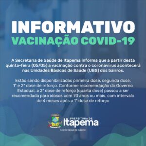 A Secretaria de Saúde de Itapema informa que a partir desta quinta-feira (05/05) a vacinação contra o coronavírus será descentralizada e acontecerá nas Unidades Básicas de Saúde (UBS) dos bairros. A mudança ocorre devido a diminuição da demanda e o crescimento do número de pessoas com esquema vacinal completo.