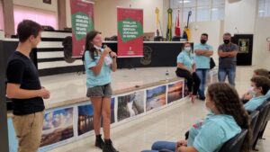 Na abertura dos trabalhos, o jovem palestrante de 18 anos, Leonardo Ames, veio promover a Oficina de Argumentação e Oratória. Leo já foi vereador mirim na cidade de Gaspar, em 2016, e, mesmo com sua pouca idade, acumula um currículo surpreendente: é autor de dois livros sobre oratória, desde os 12 anos participa de concursos de poesia, é vencedor do Concurso Distrital de Oratória de SC 2018 e vice presidente do Conselho Municipal da Juventude e presidente do clube Interact Brasil, movimento ligado ao Rotary.