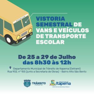 O Departamento de Trânsito Municipal de Itapema (DETRAMI) realizará de 25 a 29 de julho a vistoria semestral das vans e veículos de transporte escolar. O atendimento será no próprio Detrami localizado na Rua 902, n° 155, Bairro Alto São Bento, das 8h30 às 12h. Mais informações e a documentação para outorga de autorização pelo telefone (47) 3267 – 1576.